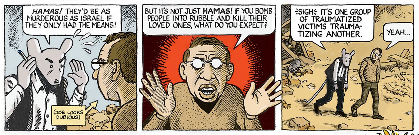 I’m honored to call Art Spiegelman a friend — the author of Maus and thus a guy who you’d really be stretching to call an anti-semite — and he’s made his position clear, including in a graphic story for The Guardian co-authored with fellow cartoon activist Joe Sacco. Please click the link and read the whole thing.